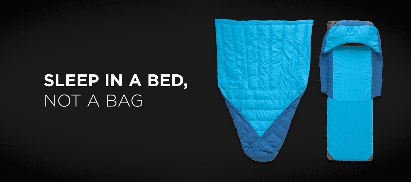 Mummy bags are restricting. Quilts are drafty. Zenbivy's patented 2-piece design lets you sleep in any position, free from drafts and constriction, in the widest range of temperatures.