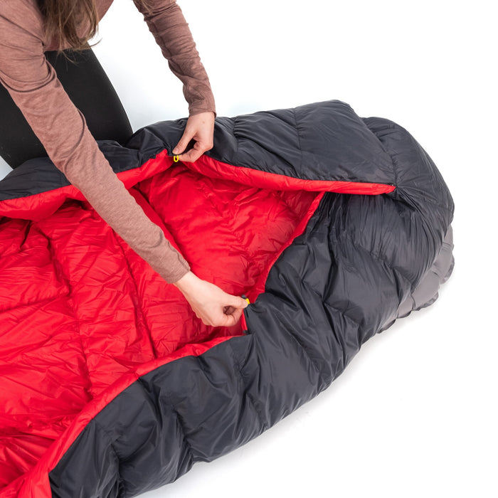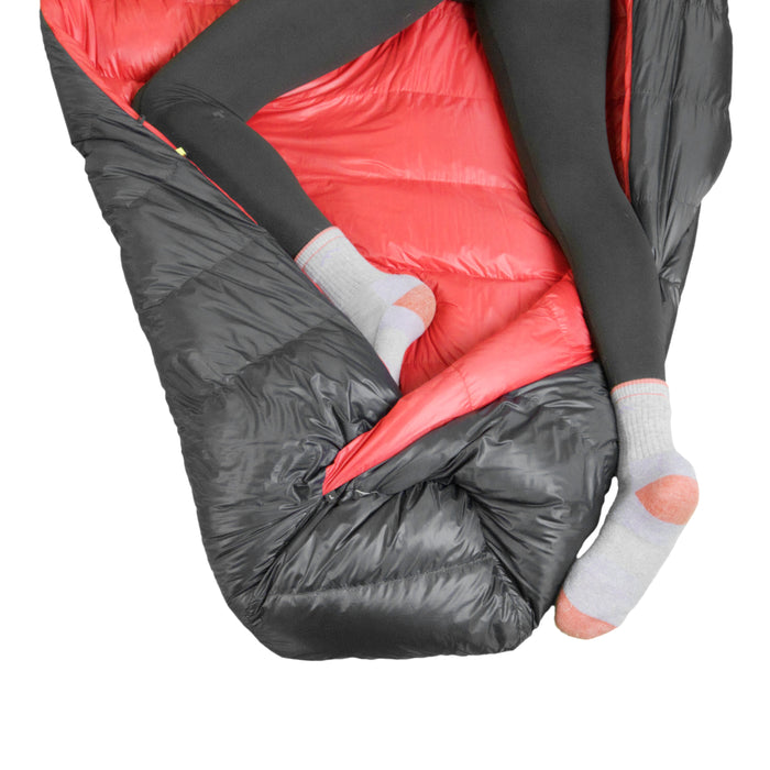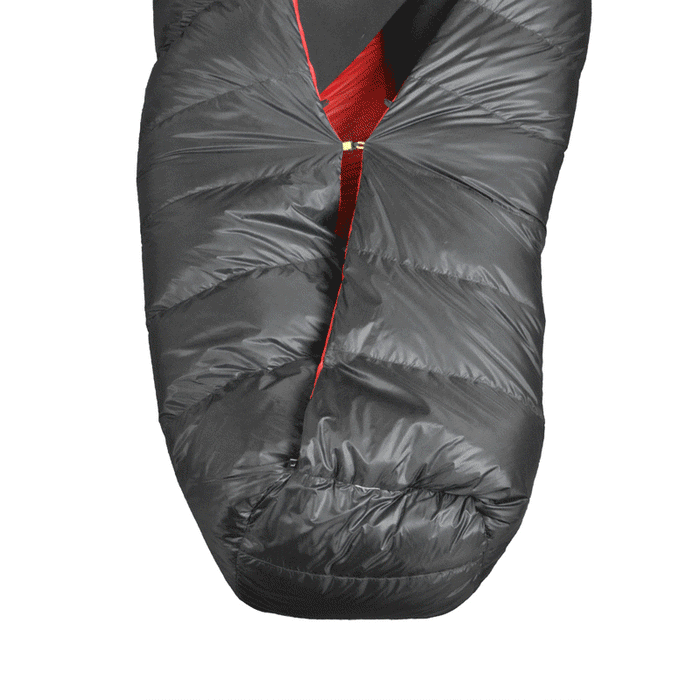 Our patent-pending semi-fixed Fast Footbox™ design offers both the warmth of a "mummy" footbox and the width of an open quilt, all with just ONE simple clip!