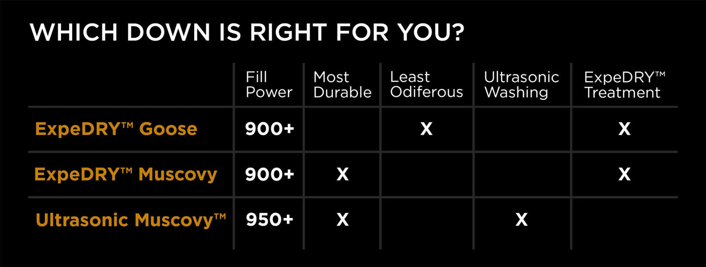 ExpeDRY™ Muscovy from ALLIED Feather + Down combines the unmatched loft and durability of Muscovy down with next-generation, water-resistant technology. Using a chemical-free bonding of non-toxic gold particles, ExpeDRY™ accelerates evaporation so insulation stays drier and dries up to 50% faster than traditional chemically-treated downs.