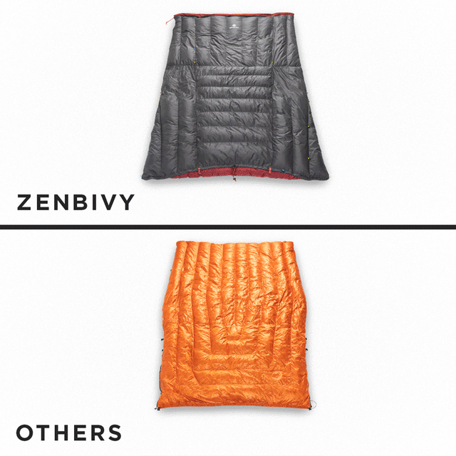 Unlike sewn footboxes that restrict your movement and do not vent, Zenbivy’s patent-pending Fast Footbox™ uses a single clip that allows it to expand for more space or narrow for more warmth.