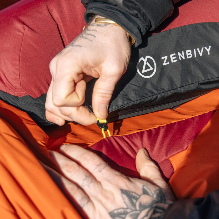 If you are an "active" sleeper or have a "wide" sleep position, consider sizing up to accommodate your sleep style. When in doubt, size up. Unlike mummy bags, there's no thermal disadvantage to a larger size Zenbivy because the quilt is always free to wrap snuggly around you. Bigger is always more comfortable and just as warm.