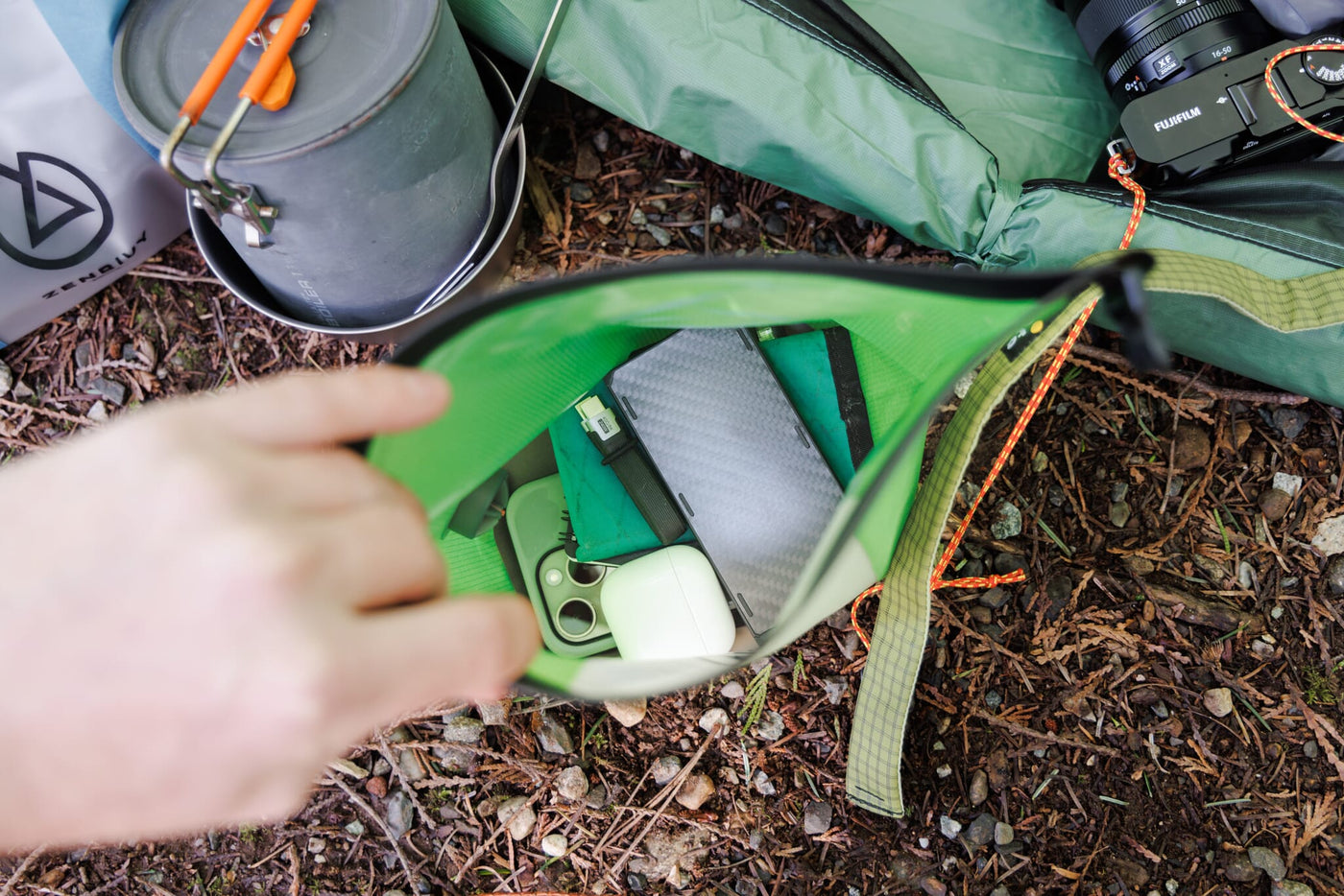 Perfect for your smallest essentials. Ideal for things like your phone, chapstick, headphones, etc—the daily-use items you want to keep dry and easy to grab throughout the day.