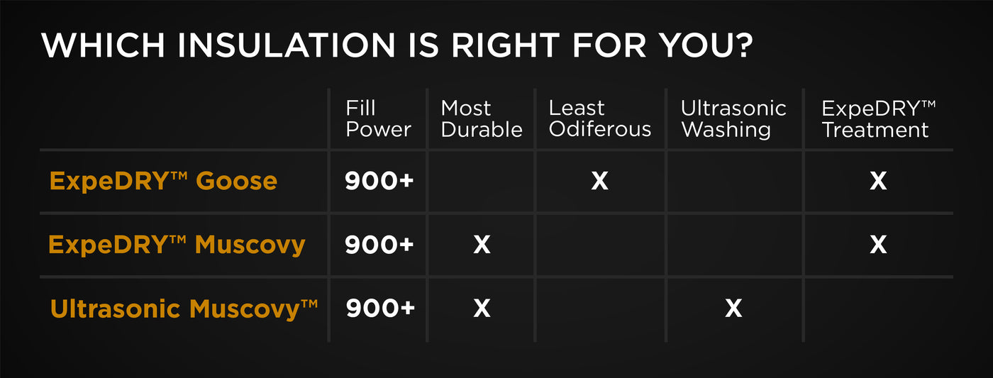 ExpeDRY™ Muscovy combines the unmatched loft and durability of Muscovy down with next-generation, water-resistant technology. Using a chemical-free bonding of non-toxic gold particles, ExpeDRY™ accelerates evaporation so insulation stays drier and dries up to 50% faster than traditional chemically-treated downs.