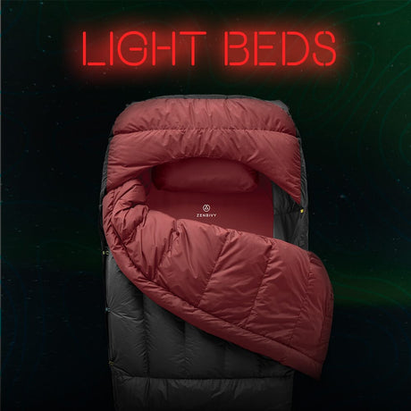 Light Sheets are comfort-mapped with 25D Pongee to add comfort where you need it and 15D Nylon to save weight where you don't.