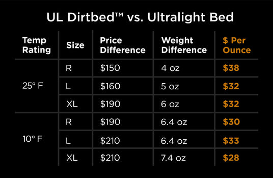 The UL Dirtbed™ saves you $28–$38 per ounce compared to our premium Ultralight Bed, with a small increase in weight.
