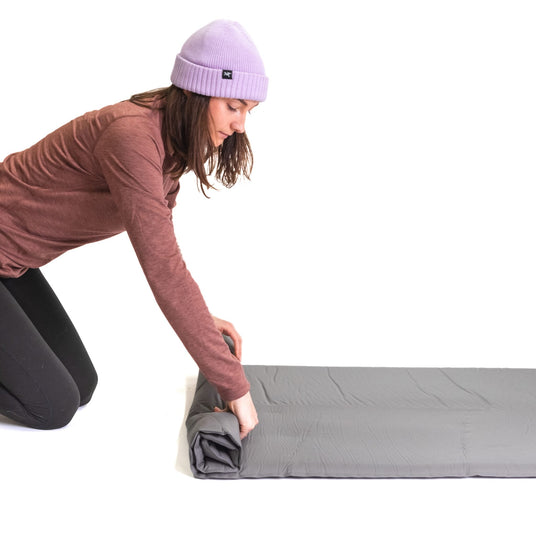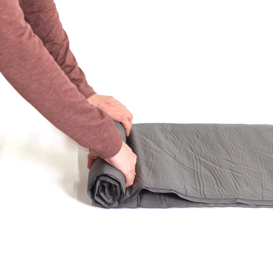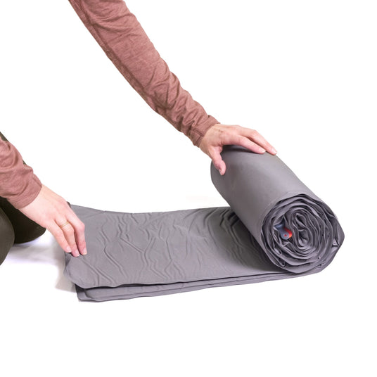 Fold it in half (or thirds if you prefer) and—starting at the foot end again—begin to tightly roll the mattress up towards the valve end.