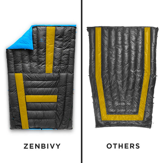 Other quilts use bulky zippers and tapered shapes, limiting how much blanket you actually get when flat. Zenbivy’s patented zipperless convertible footbox keeps the quilt rectangular. Overlapping baffles seal in warmth, ensuring a completely draft-free footbox when closed.