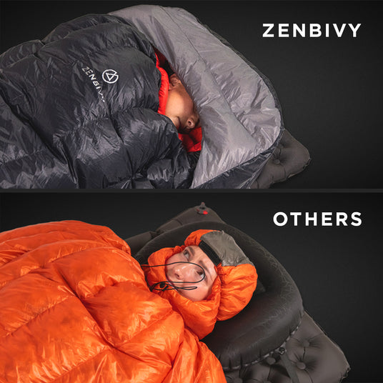 Other quilts leave you exposed with no hood, or force you into awkward add-ons like a down balaclava. Zenbivy’s sheet solves this with a built-in hood that keeps your head—and even your arms—warm and protected.