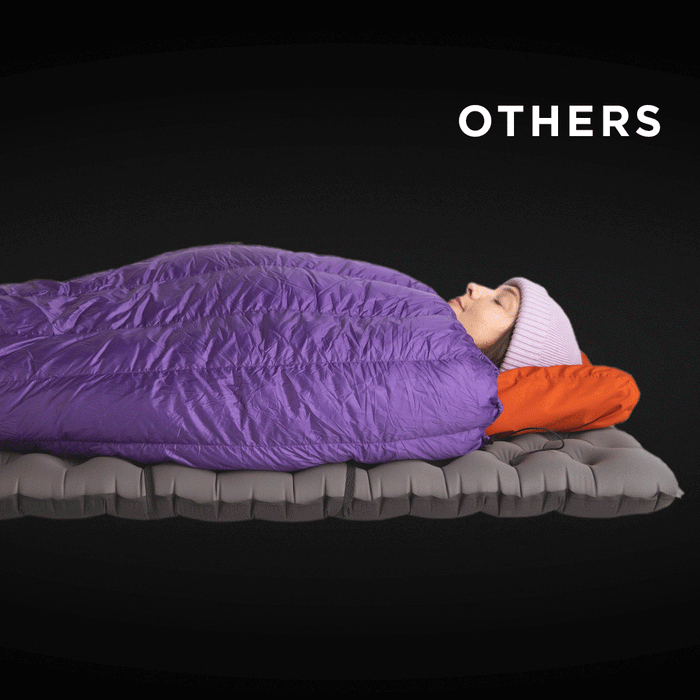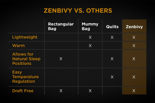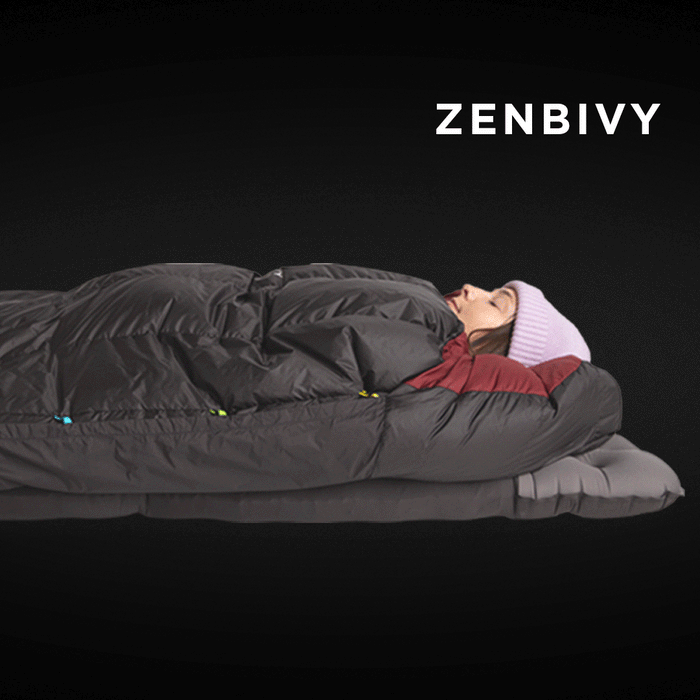 A Zenbivy Bed isn’t a mummy bag or a quilt—it’s a bed. Built just like your bed at home with a sheet below you and a quilt above, our patented 2-piece design lets you sleep comfortably in any position, without constriction, in the widest range of temperatures.