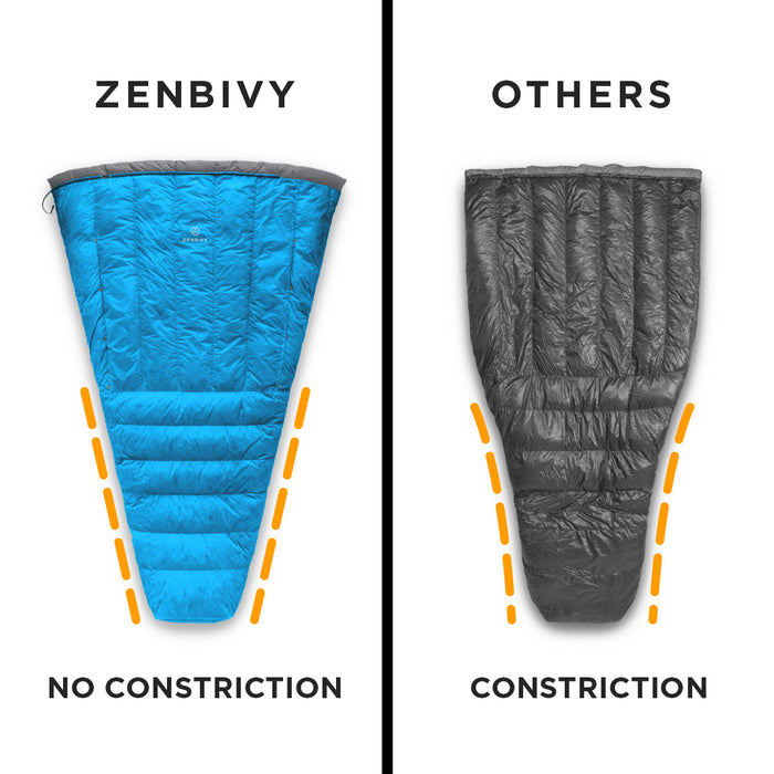 Unlike sewn footboxes that restrict your movement and do not vent, Zenbivy’s patent-pending Fast Footbox™ uses a single clip that allows it to expand for more space or narrow for more warmth.