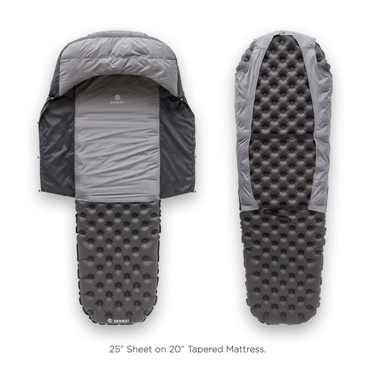 The Light Sheet Half Length features a soft 25D Pongee lining and an ultralight cropped design to cut weight without sacrificing comfort. It blocks drafts, eliminates constriction, and keeps your pillow securely in place.